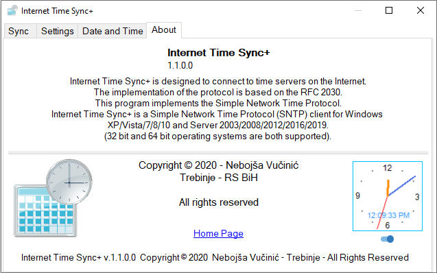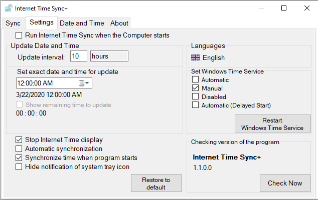 Internet Time Sync+ v.1.1.0.0 The program is designed to connect to time servers on the Internet. REQUIREMENTS: Microsoft .NET Framework 4.0 Client Profile Size: 1.3 MB More Internet Time Sync+.exe